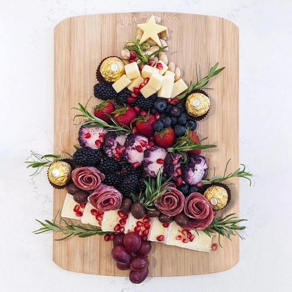 A festive charcuterie shaped like a tree, layered with colorful sweet and savory bites.